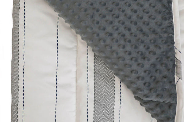 Looking for a stylish yet cozy blanket? The Ethan Beddy’s blanket is exactly what you’ve been searching for! We’ve taken two of our best sellers, the Evan and Reese Beddy’s, and combined them into one blanket design that will work perfectly with either of these Beddy’s! This blanket showcases a herringbone stripe and blue dash stripe design, adding a sleek touch to any room.