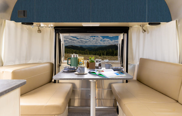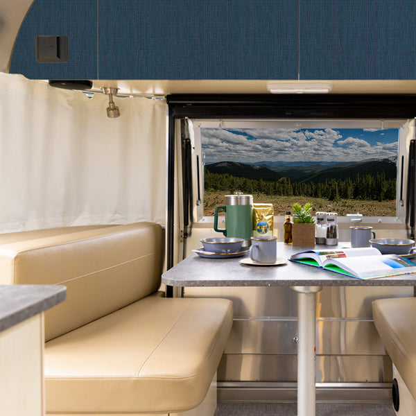 Easily achieve a minimalist, Airstream-inspired interior with Faux Textured Rattan peel and stick wallpaper. Designed to bring natural sophistication to your space, this pattern mimics woven rattan, adding warmth and style to your Airstream’s walls. Whether you’re creating a cozy dinette accent wall or enhancing the entryway, this removable wallpaper fits seamlessly into modern, bohemian, or coastal-inspired Airstream designs. Available in warm taupe and vibrant blue, its peel and stick application makes it perfect for renters or Airstream owners looking to refresh their mobile space with a timeless, textured look.