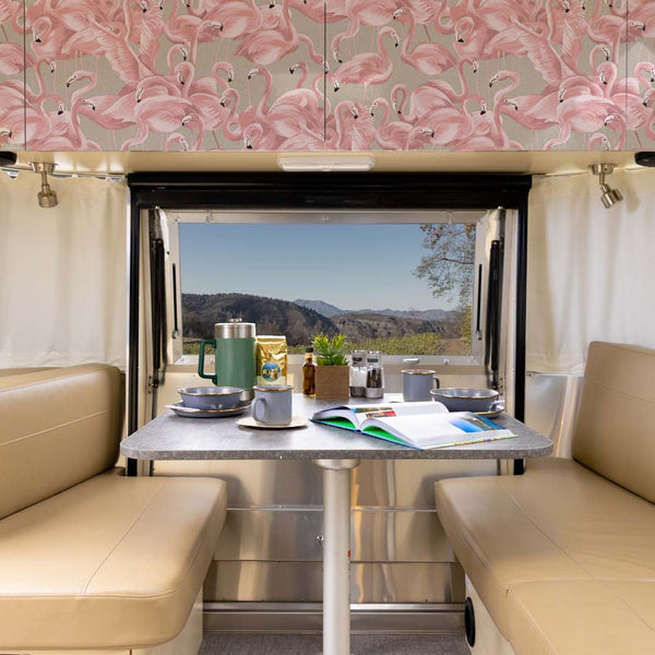 Graceful yet bold, these tall flamingos bring vibrant personality to your Airstream interior. Airstreamers have long embraced the flamingo as a symbol of fun, flair, and roadside charm—and our best-selling Flamingo peel and stick wallpaper is a playful way to show off that tradition. Whether it’s an accent wall in the lounge, a splash of color in the bathroom, or a standout moment in a bunk, this vivid design turns heads at every campsite. And the best part? It’s as easy to apply and remove as it is to love—no balancing on one leg required.