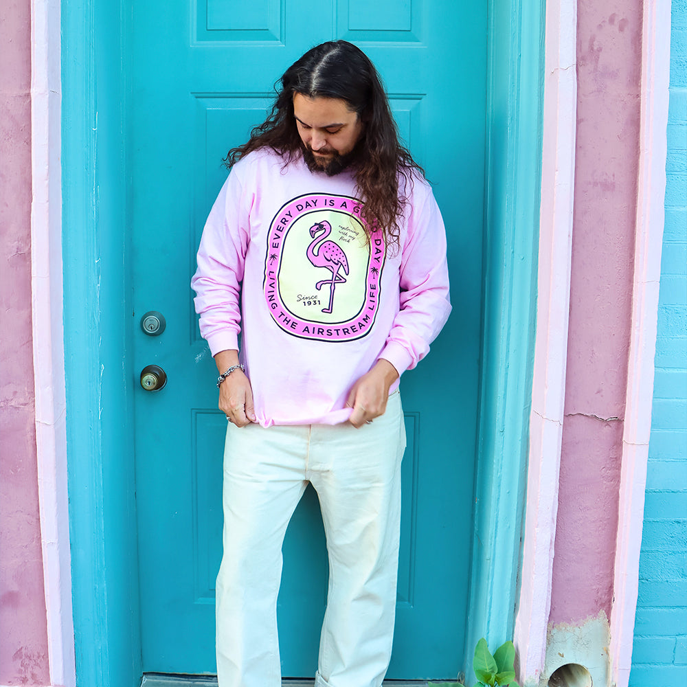 Embrace the iconic Airstream spirit with this comfortable long sleeve tee featuring a charming flamingo design. Perfect for casual wear, road trips, or showing your love for vintage travel vibes. Crafted for everyday comfort, this shirt pairs effortlessly with your favorite jeans or shorts.