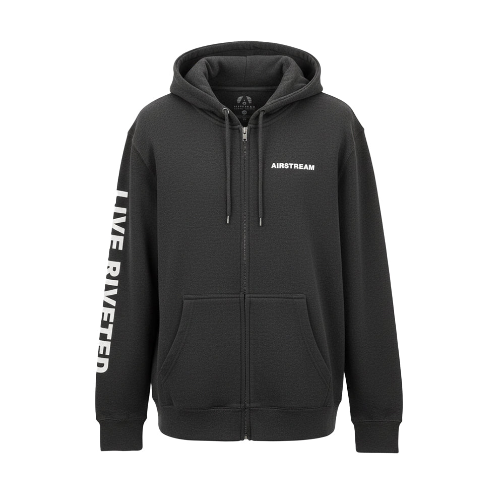 Celebrate your Airstream spirit with this classic rally hoodie. Featuring the iconic Airstream logo across the chest and "Live Riveted" running down the sleeve, it's the perfect way to show your passion for the open road. Built for comfort and durability, this full-zip design layers easily over your favorite tee for adventures near and far.