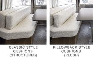 Optional Pillowback Design: Experience the cozy charm of home on the road with our upgraded cushion backs, featuring a pillowback style. This new design not only enhances comfort but also adds a warm, inviting touch to your Airstream’s interior. You can choose between classic cushions or a plush pillowback design. *It is recommended to select classic cushions if you plan to convert your dinette to a sleeping area (for a seamless flat surface)