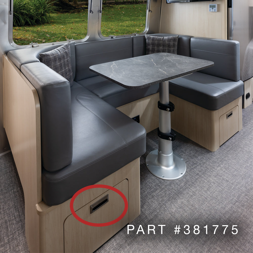 The Airstream Interior Flush Door Pull (Part # 381775) is a genuine replacement hardware piece designed for use on Airstream cabinet drawers. Featuring a low-profile, flush design, it maintains the clean, streamlined look of your interior while providing easy, reliable access to storage areas. Ideal for replacing worn or damaged pulls, this part helps restore the original function and finish of your Airstream cabinetry.
