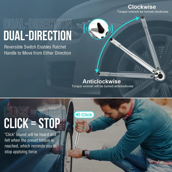 This ½" Drive Torque Wrench Tire Change Kit includes a micrometer torque wrench, five-inch extender bar, and 3 different sizes of mm sockets, 17, 19 and 21. Those cover most common lug nut sizes. The torque wrench comes with a protective head bumper and offers both forward and reverse torque capabilities.